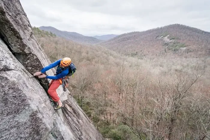 The main wall is west facing, so it's relatively cool in the summer and somewhat warm in the winter. Cedar Rock’s Stone Depot face boasts some great first multi-pitch climbs that offer some real NC adventure climbing!