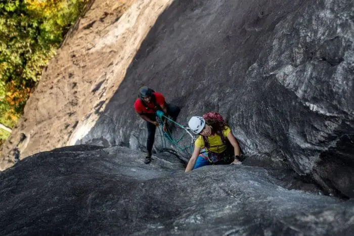 This wall not only boasts the tallest continuous rock climbs on the East coast but also some of the scariest runouts! Likely the best slab route in the country is climbing Have and Not Need to Fathom Direct (5.10+) where nearly all the pitches are in-your-face climbing at the 5.10 level. The better routes to cut your teeth on are Groover (5.8) and Seconds (5.8+). Seconds comes in at just over 1000 ft. of climbing making it an awesome experience for the 5.8 climber.